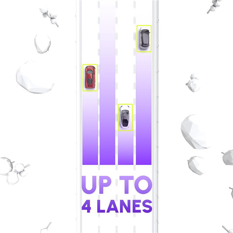 Multilane coverage of up to four lanes, using dual onboard cameras with object tracking and categorization, ensures precise vehicle attribution even in dense traffic scenarios.